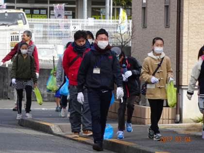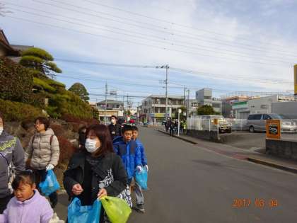 高専通りから折れて、モウモウ坂に向かいます。先生と一緒に2・4・6年生がゴミ拾いをしてくれています。