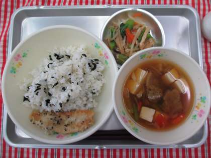 わかめごはん 笹かまぼこの南部揚げ 女川汁 彩和え 牛乳