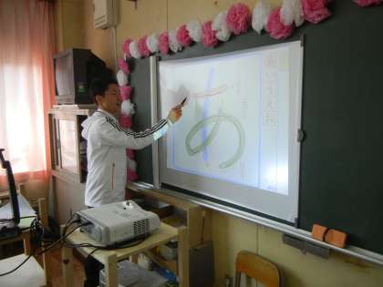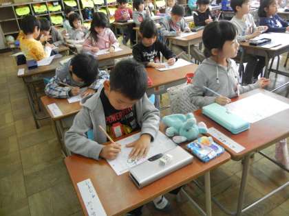 1年1組ではひらがなの「あ」の書き取り練習をしていました。