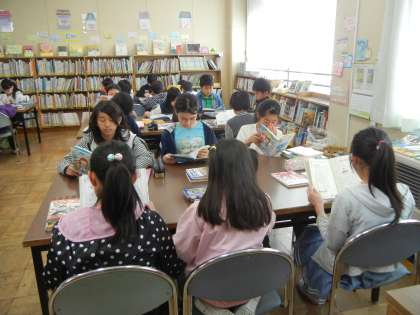 図書室をのぞくと、5年1組が読書をしていました。誰一人おしゃべりをする子もいない状態で、真剣に読んでいました。