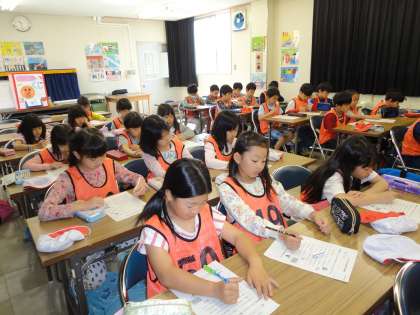 室内では、自転車の安全な乗り方について、ビデオ学習やお話を聞いた後、免許をもらうためのテストを行いました。