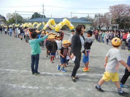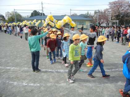 1年生は、入学式からこの日初めて、校庭デビューします。5年生がアーチを持って、出迎えてくれました。