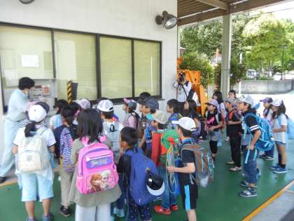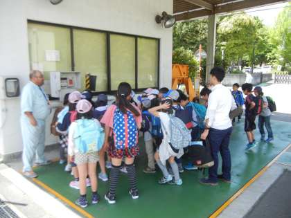 工場内を見学した後は、工場の周りを見学です。ごみ収集車が入る場所では、においのきつさを実際に嗅いだり、収集車が通る軽量機に乗って、クラスごとの重さを計ったりしました。
