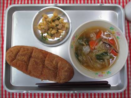 黄な粉揚げパン 豆腐団子のスープ 鶏肉と大豆の炒め物 牛乳