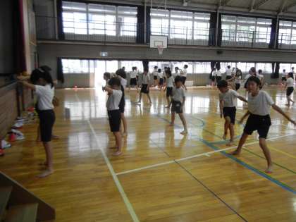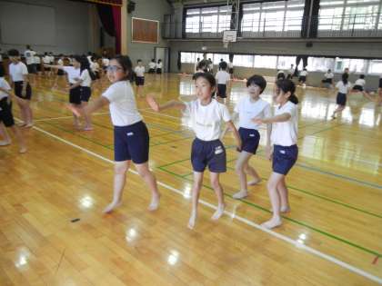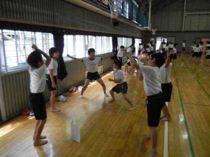 12日、体育館では、5年生が「椚田ソーラン」の練習をしていました。