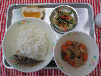 ごはん 豆鯵のからあげ だいこんのそぼろ煮 アーモンド和え 果物 牛乳