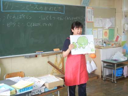 5月16日、2年生が食育授業で、「グリンピースの皮むき」をしました。まずは、栄養士さんが、グリンピースについて、いろいろとお話を聞かせてくれました。