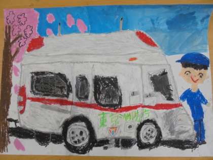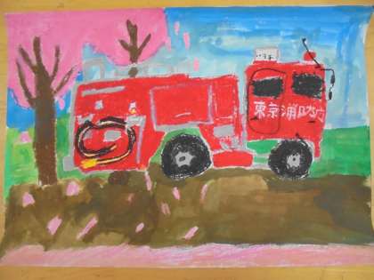 4月14日に、2年生が行った消防写生会の学年代表作品です。写真は1組児童の作品です。