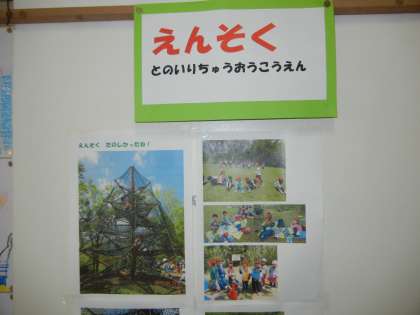 1年生の教室外には、遠足で行った殿入中央公園の絵が飾られていました。