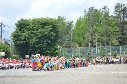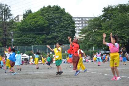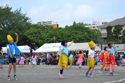 カラフルな衣装を身に着け、オリジナルダンスで、校庭を踊りまわります。