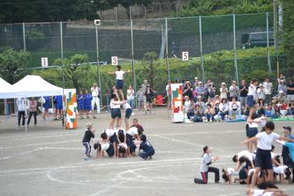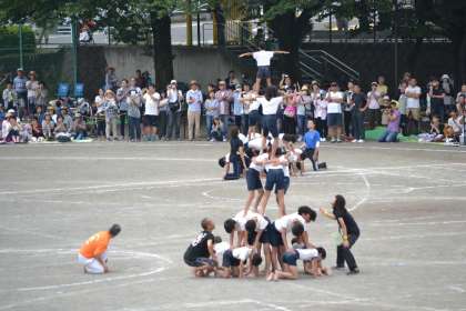 各学級で2つのタワーを立てます。全タワーが完成しました。会場からも大きな拍手が沸き起こりました。