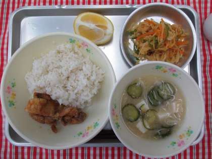 麦ごはん チキン南蛮 千切り大根のピリ辛炒め そうめん汁 日向夏 牛乳
