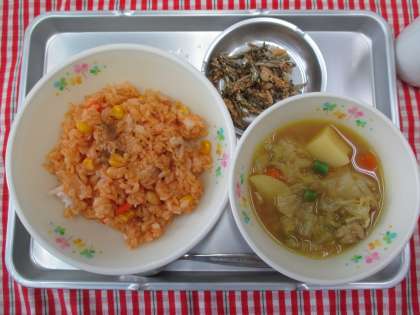 大豆ピラフ 野菜のカレースープ煮 手作り魚ナッツ 牛乳