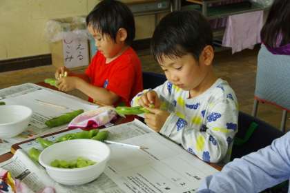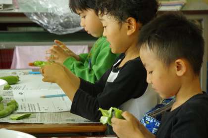 初めて体験する子が多く、興味津々にお話を聞きながら、自分たちがむいたそら豆が、給食に出されると知り、嬉しそうにしていました。