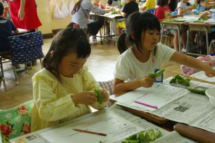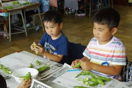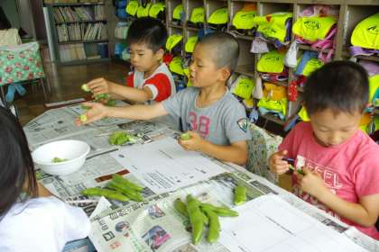 どの子も真剣に向いています。皮の内側には細かい毛があり、「ふわふわのベッドみたいだ。」と言っている子もいて、観察力と表現力に感心しました。