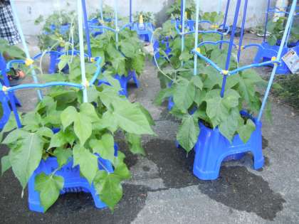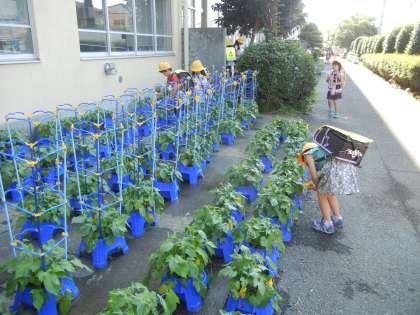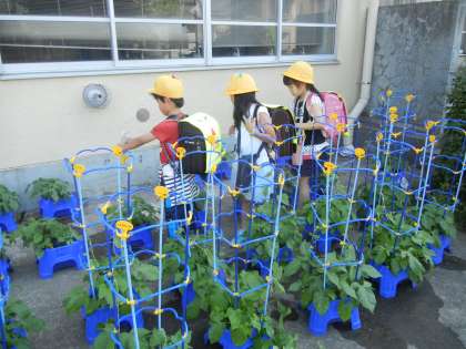 昨日の雹はびっくりしましたが、1年生が育てている朝顔は元気です。今朝も、1年生が朝の水やりをしていました。