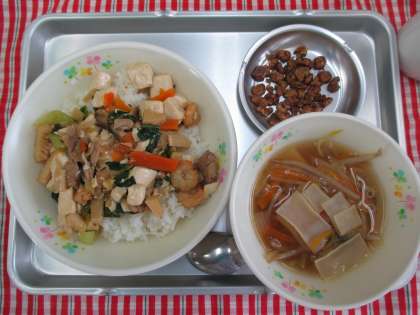 海鮮豆腐丼 ワンタンスープ くるみ黒糖 牛乳