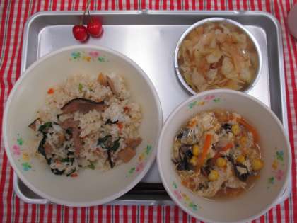中華風たきこみごはん 春雨スープ じゃこだいこん さくらんぼ 牛乳