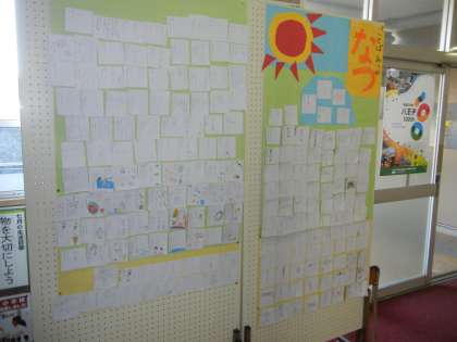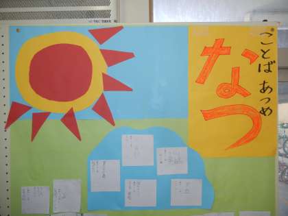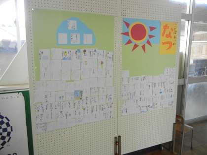 国語の校内研究の一環で、「夏」に関する言葉集めをしました。たくさんの子供たちが、夏の言葉を集めてくれました。なかには「星うつし」や「金雀枝(えにしだ)」などもありました。