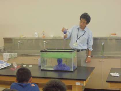 水槽を使った噴火実験です。噴火や火砕流のメカニズムがよくわかる実験で、子供たちから歓声が上がっていました。