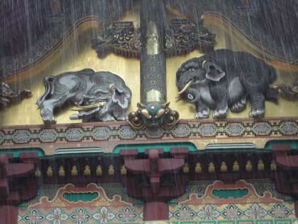 東照宮ではガイドさんについてもらい、いろいろな説明をしてもらいながら見学しました。三猿や想像の象もきれいに塗り直されたこともあり、雨の日でもたくさんの観光客がいました。