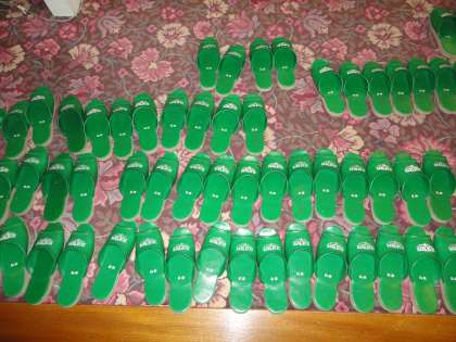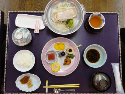 宿での初めての食事です。配膳からすべて、宿の方がやってくれます。大広間の入り口には、スリッパがきちんと並べられていました。さすが6年生です!