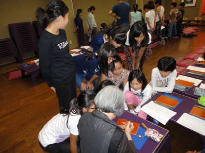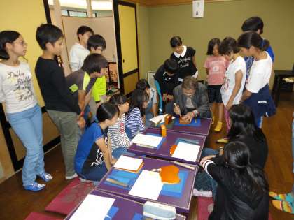 3人の先生が、実演してくれています。下絵もなしに見事な作品を仕上げていきます。子供たちからは歓声が上がっていました。