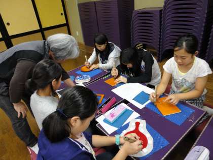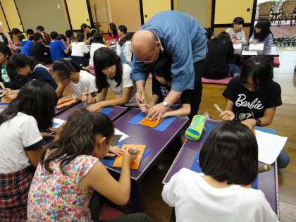 子供たちは、事前に考えてきた下絵をもとに彫っていきます。