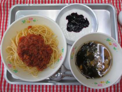 スパゲティミートソース わかめスープ ヨーグルトブルーベリーソース