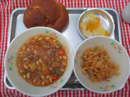 パン ポークビーンズ たぬきサラダ フルーツ缶 牛乳