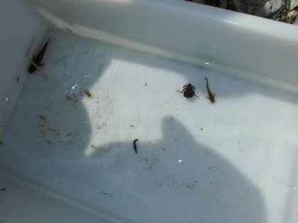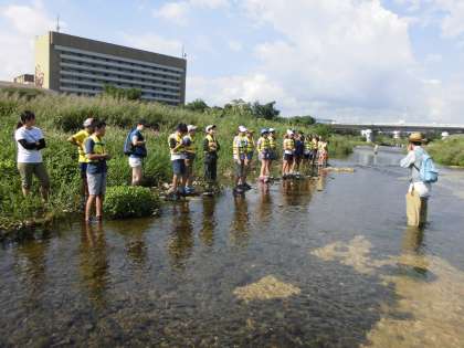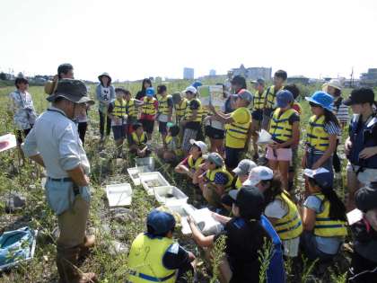 全体を3つのグループに分け、学習します。第一グループは、始めに水生生物を採集し、観察しました。中には、珍しい「コオニヤンマ」のヤゴもいました。