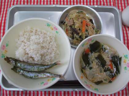 ごまごはん ししゃもの磯辺焼き ゆばとわかめの澄まし汁 ビーフン炒め 牛乳