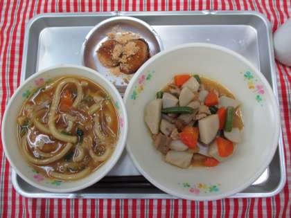 カレー南蛮 お月見団子の黒蜜かけ 鶏肉と里芋の煮物 牛乳