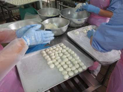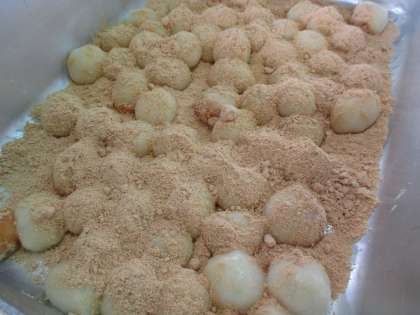 給食ではお月見団子を1つ1つ丸めて作り、きなこをまぶし 黒蜜をかけて食べます。