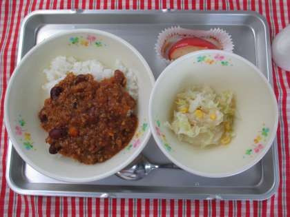 チリコンカンライス じゃがいもサラダ 焼きりんご 牛乳