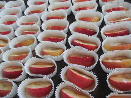 焼きりんごは給食室でりんごを切り、バター・砂糖をかけてオーブンで焼きます。