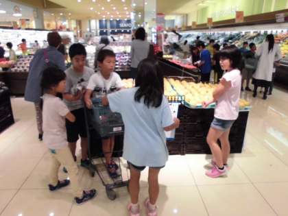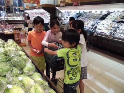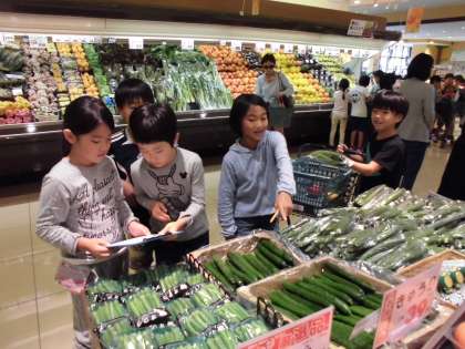 「旬の野菜や果物を買う」、外と中の色の違う野菜を買う」などなど、子供たちは、グループで相談しながら回りました。