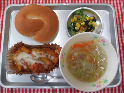 パン ラザニア ジュリエンヌスープ 青菜とベーコンの炒め物 牛乳