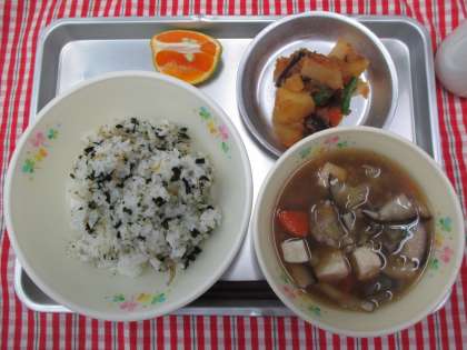 磯ごはん じゃがいもの煮つけ つみれだんご汁 くだもの 牛乳