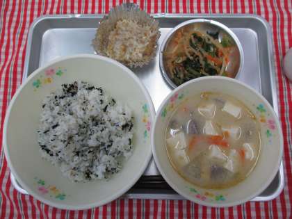 わかめごはん 海鮮いがむし 呉汁 もやしのアーモンド和え 牛乳