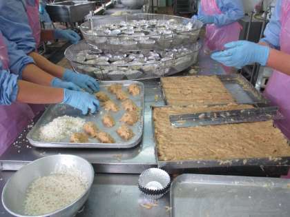 海鮮いがむしは たらすりみ、えびすりみ、たまねぎ、調味料をまぜあわせ丸めます。