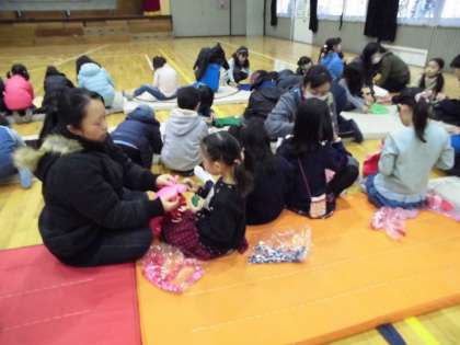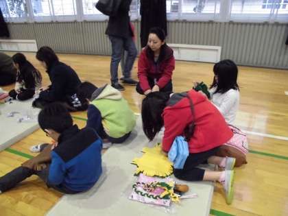 11月18日、サタデースクールがありました。今回の目玉企画は「フェルトのバッグ作り」です。体育館で行いました。