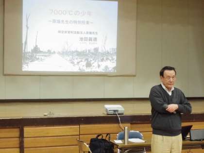 11月30日、6年生の社会科に原爆先生がゲストティーチャーとして来てくださいました。毎年度、6年生の子供たちに平和とは何かを考えさせる授業をしてくださいます。