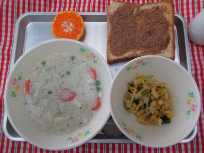 アーモンドトースト 白インゲン豆入りクリーム煮 小松菜とコーンのサラダ みかん 牛乳