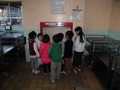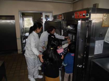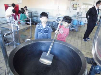 初めて入る調理室に、1年生は目を丸くしながら、説明を聞いたり、器具を触らせてもらっていました。