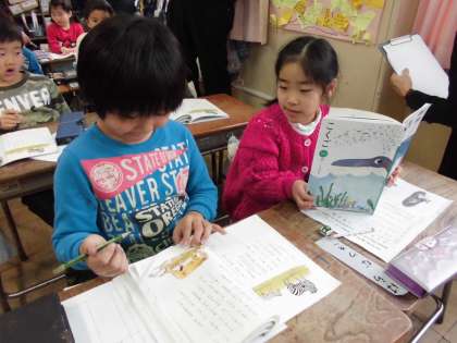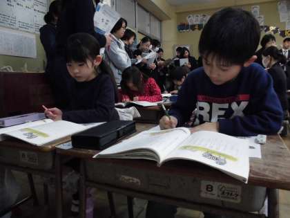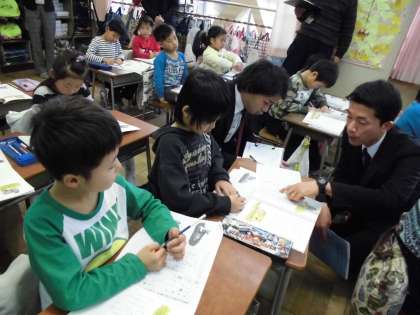 自分の考えを伝えあうペア学習を取り入れた授業です。子供たちは、大勢の先生方が来る授業は初めてなので、一生懸命頑張っていました。