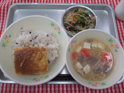 小豆ごはん 豆腐の田楽焼き 青菜ともやしの煮びたし 豚汁 牛乳