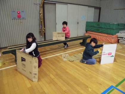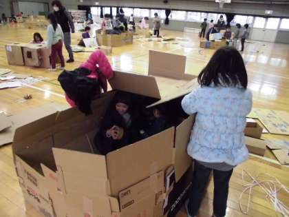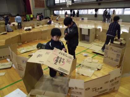 体育館では、2年生が、図工の時間に段ボールを使って、段ボールハウスつくりをしていました。