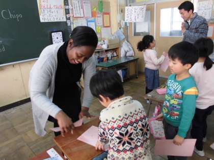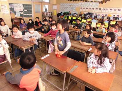 音楽がなっている間に、さいころを受渡し、自分の名前を、英語で言っていきます。