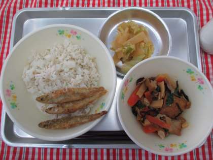 ごまごはん わかさぎの香り揚げ 生揚げの味噌炒め じゃこだいこん 牛乳